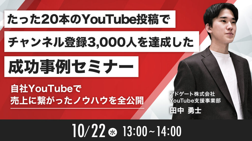 | セミナー名 | たった20本のYouTube投稿でチャンネル登録3,000人を達成した成功事例セミナー |